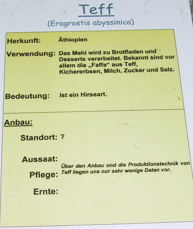 Teff, ist ein altes äthiopisches Kulturgetreide. Es wird in Äthiopien bis heute angebaut und gehört dort zu den wichtigsten Grundnahrungsmitteln. Aufgrund seiner kleinen Samenkörner (weniger als 1 mm Durchmesser!!!) kann das Saatgut für ein ganzes Feld in einer Hand getragen werden. Der Geschmack gilt als angenehm-nussig. Teff hat einen hohen Eisen- und Calciumgehalt, außerdem enthält Teff kein Gluten. Damit stellt Teff einen Rohstoff für glutenfreie Backwaren dar und wird z.B. für Brotmischungen verwendet.